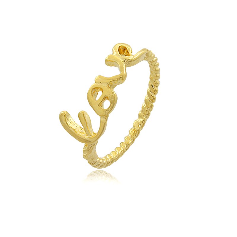 Anel delicado e cheio de significado, com a palavra “love” em destaque e aro com textura torcida que traz charme e exclusividade à peça. Ideal para quem ama acessórios com estilo romântico e moderno. Uma joia perfeita para presentear ou usar no dia a dia.