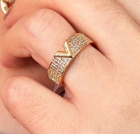 - Com um visual contemporâneo e cheio de brilho, esse anel dourado é destaque por seu design em "V" central, Inspiração. As laterais são cravejadas com zircônias que garantem um efeito luminoso e sofisticado.
