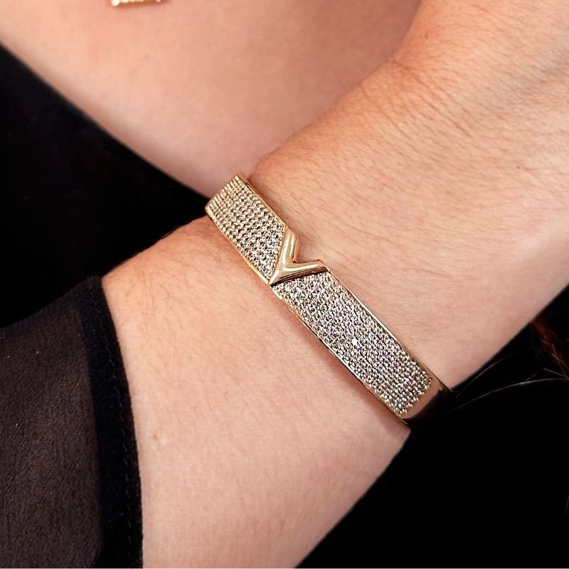 - Um bracelete elegante e cheio de brilho, com aplicação de micro zircônias que trazem sofisticação e glamour à peça. O detalhe central em formato de "V" confere um charme moderno e diferenciado, ideal para quem busca uma semijoia delicada e impactante ao mesmo tempo.