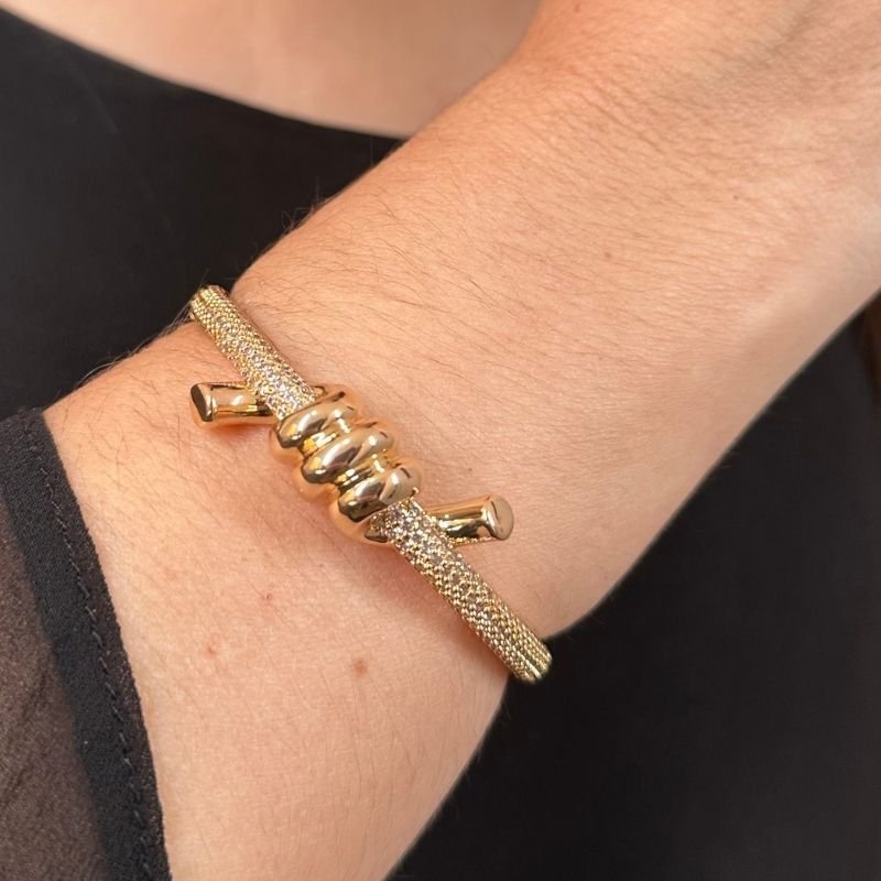 - Esse bracelete dourado com detalhe de nó é a peça perfeita para quem busca sofisticação com um toque moderno. Com acabamento texturizado e fecho seguro, ele combina elegância e praticidade em um design atemporal. Ideal para compor looks refinados, tanto no dia a dia quanto em ocasiões especiais.