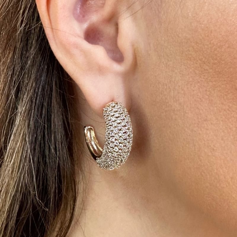 - Ilumine seu rosto com o brilho exuberante do nosso Brinco Meia Argola Dourada Cravejada. Uma joia clássica e atemporal, reinventada para quem busca o máximo de cintilância e elegância.