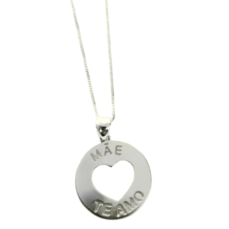 Pingente: Circular com coração vazado e a frase “MÃE TE AMO”