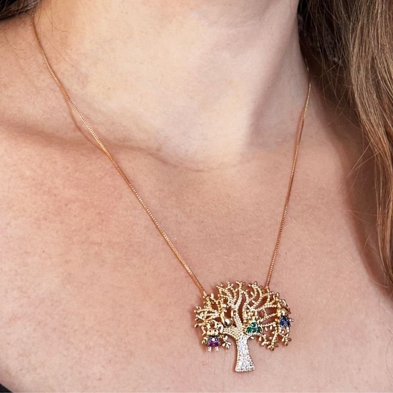 - Encante-se com esse colar delicado e cheio de significado! Com um pingente de árvore da vida cravejado em zircônias e detalhes coloridos que representam filhos, ele simboliza amor, proteção e união familiar. A corrente é do tipo veneziana, medindo 48 cm com 5 cm de extensor, perfeita para ajustar ao seu estilo e conforto. Ideal para presentear ou carregar perto do coração quem você ama!