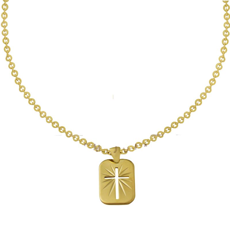 Este colar é a combinação perfeita entre fé e estilo. Com banho de ouro 18k, a peça possui corrente elo português e um pingente retangular com cruz vazada e detalhes em alto-relevo que remetem a um brilho solar. Um acessório moderno, simbólico e cheio de significado, ideal para quem busca estilo com propósito.