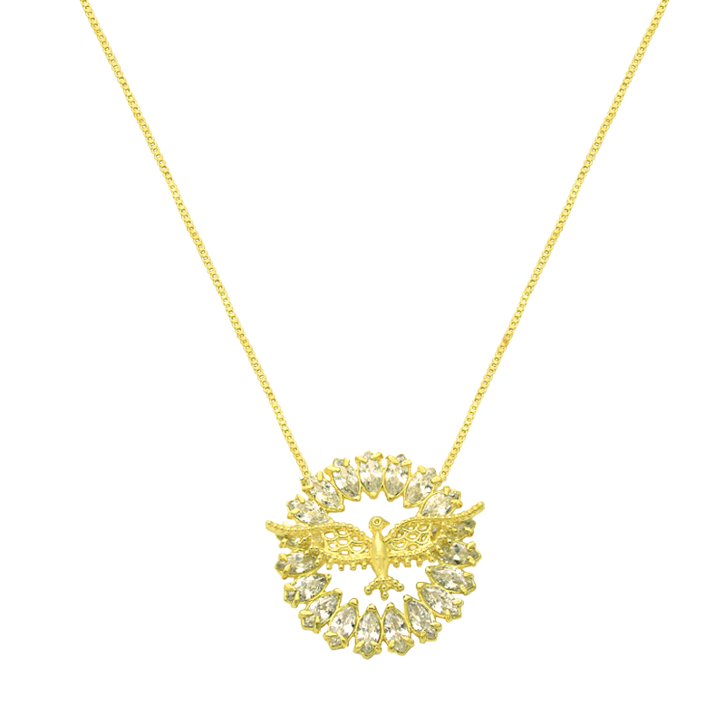 Expresse sua fé com este colar folheado a ouro, apresentando um pingente redondo do Divino Espírito Santo. A figura da pomba é envolta por uma aura cravejada com zircônias cintilantes. Possui 45 cm de comprimento.