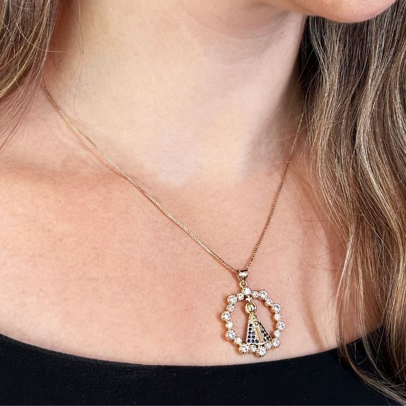 - Um colar que carrega fé, proteção e brilho! O pingente de Nossa Senhora Aparecida é envolvido por um círculo de zircônias claras, trazendo delicadeza e significado espiritual à peça. Detalhado em tons dourado e azul, é perfeito para expressar sua devoção com elegância. Acompanha corrente veneziana de 46 cm + 5 cm de extensor, com caimento leve e sofisticado. Um presente ideal ou um amuleto pessoal para levar sempre consigo!