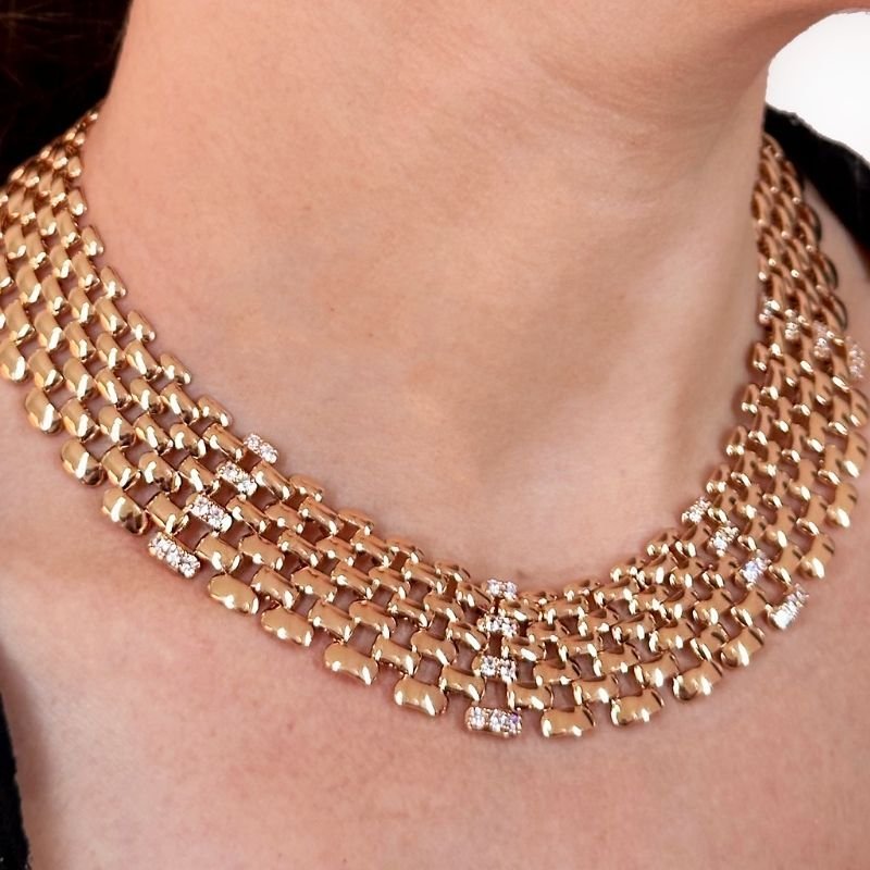 Sua estrutura em malha dourada lisa é pontuada por brilhos estrategicamente distribuídos, graças às zircônias que adicionam um charme extra. É a escolha ideal para complementar um decote ou para ser usada sobre blusas e vestidos, transformando qualquer visual em uma declaração de estilo. Um clássico moderno que oferece versatilidade e elegância para todas as horas.