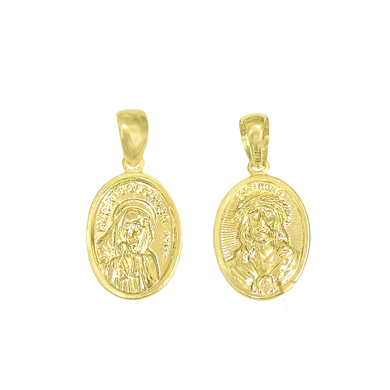 Leve a sua devoção em dobro com esta medalha oval folheada a ouro, apresentando em um lado a imagem de Nossa Senhora e no outro, a face de Jesus Cristo. Uma joia religiosa versátil e cheia de significado.