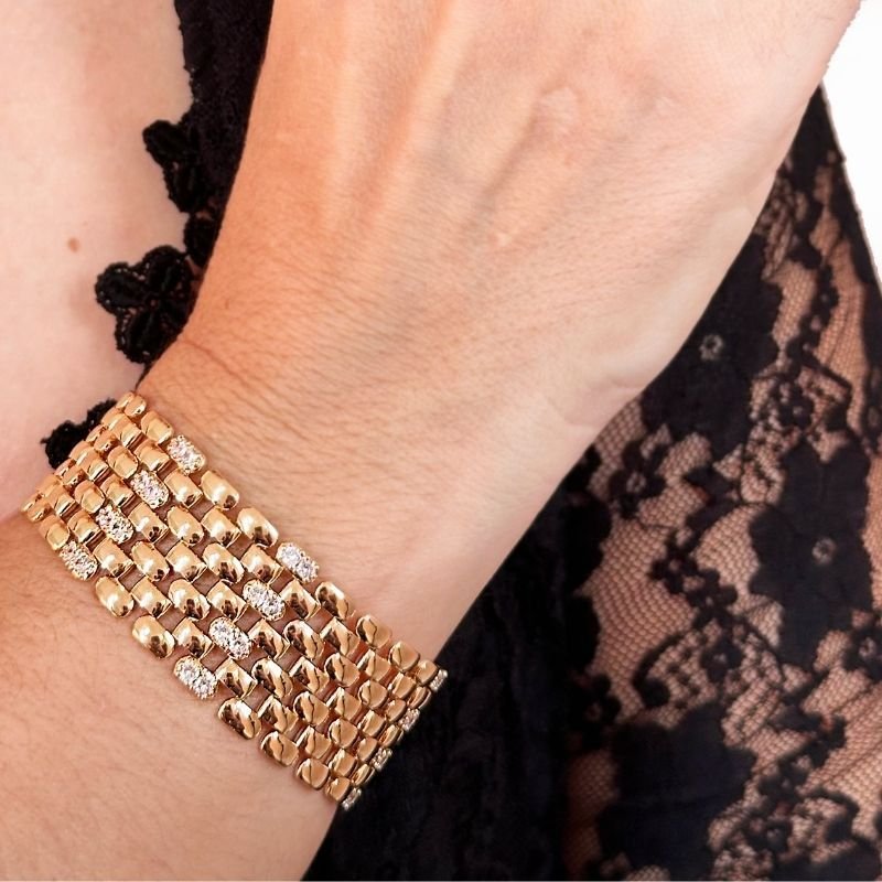 - Descubra a elegância singular da nossa Pulseira Dourada Malha Laminada, uma peça que combina design arrojado com o brilho sutil de pontos de luz. Com sua estrutura em malha laminada dourada, esta pulseira abraça o pulso com conforto e sofisticação.